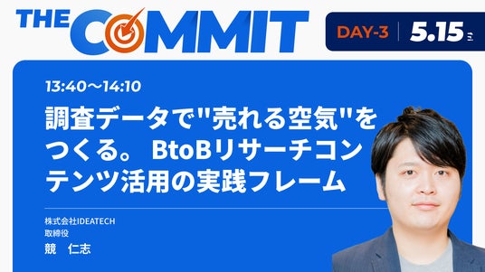 ファクトに基づいたコンテンツ開発とマーケティング支援を行う、株式会社IDEATECH(本社:東京都港区、代表取締役社長:石川友夫、以下 IDEATECH)は、株式会社マーケティングコミット(本社:東京都新宿区、代表取締役社長:吉田博嗣)主催のカンファレンス「THE COMMIT」に、2026年5月15日(金)に登壇いたします。尚、IDEATECHは、取締役の競仁志が13:40~14:10の枠で「調査データで"売れる空気"をつくる。BtoBリサーチコンテンツ活用の実践フレーム」のタイトルの下、効果的なマーケティング手法を具体的な実践例とともに徹底解説いたします。