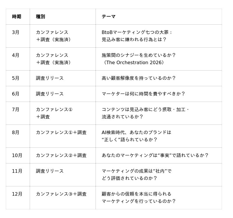 本シリーズは、年間9本の独自調査と、4月・7月・10月・12月に開催するオンラインカンファレンスを組み合わせた年間プログラムです。唶3発の情報発信にとどまらず、「3月:見込み客に嫌われる行為とは何か」から始まり、「12月:顧客から真に信頼を得るマーケティング」へとつながる年間ナラティブを設計しており、マーケターが1年を通じて自社の活動を点検できる構造です。