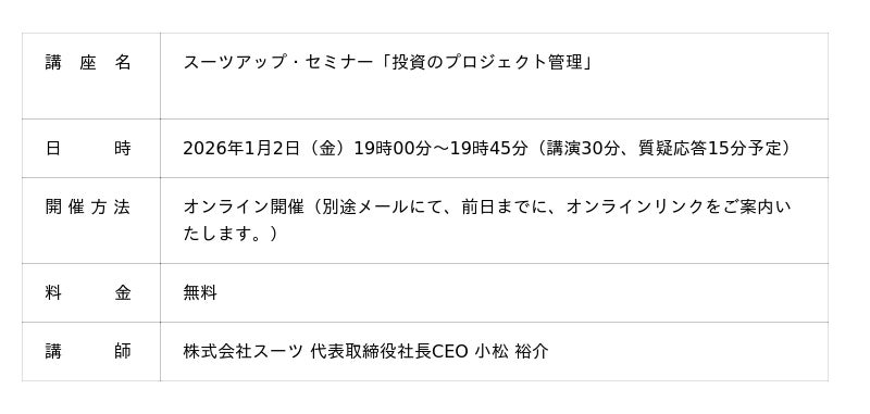 株式会社スーツ(所在地:東京都千代田区、代表取締役社長CEO:小松 裕介)は、2026年1月2日(金)19時から、2026年最初となる当社代表の小松が講師を務めるスーツアップ・セミナー「投資のプロジェクト管理」を無料開催します。