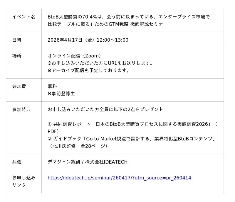 ファクトに基づいたコンテンツ開発とマーケティング支援を行う、株式会社IDEATECH(本社:東京都港区、代表取締役社長:石川友夫、以下 IDEATECH)は、元Microsoft業務執行役員で独立コンサルタントの北川裕康氏が代表を務めるデマジェン総研と共催で、2026年4月17日(金)にオンラインセミナーを開催いたしますので、お知らせします。