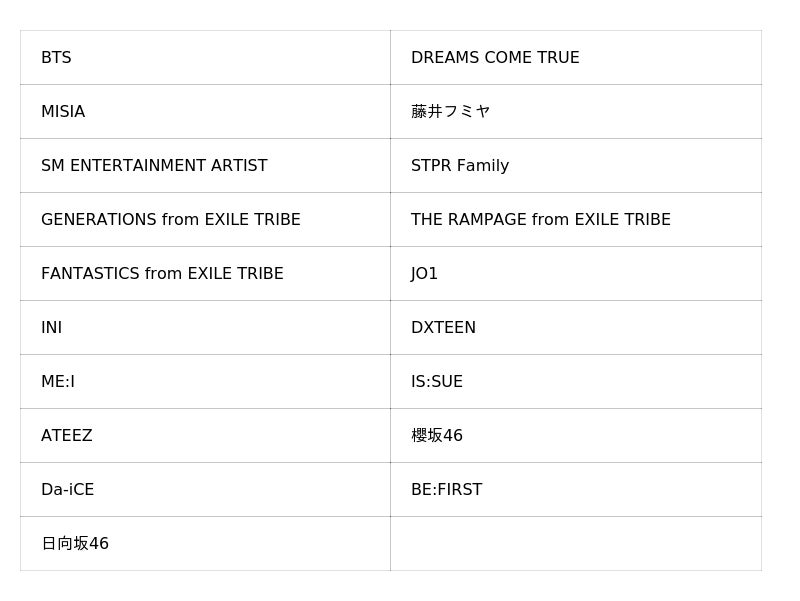 ・音楽ライブ放送・配信アーティスト(参考例 一部抜粋)