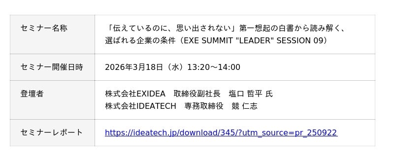 コンテンツPR・コンテンツマーケティング・コンテンツセールスを総合支援する株式会社IDEATECH(本社:東京都港区、代表取締役社長:石川友夫)は、2026年3月18日に開催された「EXE SUMMIT "LEADER" 」での共催セッション、「『伝えているのに、思い出されない』第一想起の白書から読み解く、選ばれる企業の条件」のレポートを無料公開いたしました。