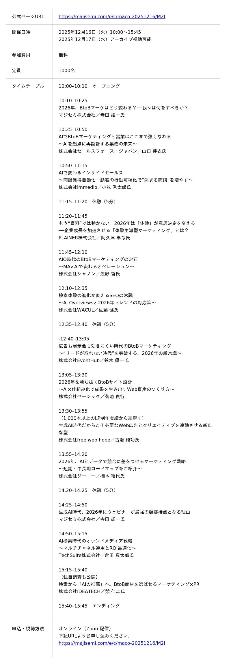 本イベントでは、検索・広告・営業・Web・体験設計・オペレーションなどの主要領域を横断し、生成AI時代に押さえるべき12の視点を専門家が解説。環境変化を前向きに捉え、自社の強みを生かして「2026年の勝ち筋」を描くための実践的なヒントをお届けします。