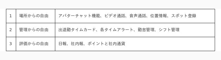 私たちは、現代社会が抱える3つの不自由(場所、管理、評価)を解消し、社員をストレスから解放することで、イノベーションを起こす企業が誕生する空間を実現していきたいと考えています。