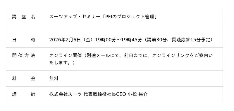 株式会社スーツ(所在地:東京都千代田区、代表取締役社長CEO:小松 裕介)は、2026年2月6日(金)19時から、当社代表の小松が講師を務めるスーツアップ・セミナー「PFIのプロジェクト管理」を無料開催します。