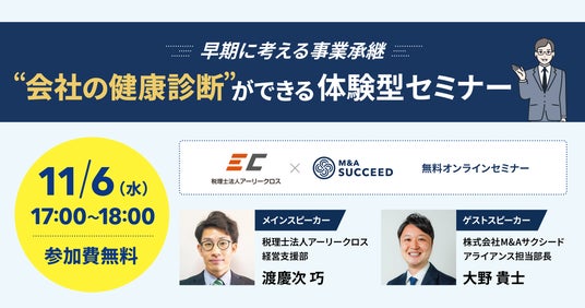https://ma-succeed.jp/)は、税理士法人アーリークロスが主催する、無料オンラインセミナー「早期に考える事業承継“会社の健康診断”ができる体験型セミナー」(2024年11月6日)に登壇することをお知らせします。