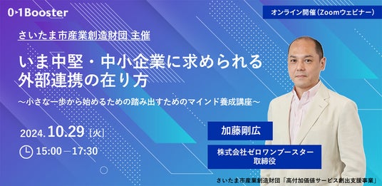 本セミナーは、さいたま市産業創造財団が主催する「高付加価値サービス創出支援事業」の一環として開催し、続く第二回はさいたま市内にてオフラインでの開催を予定しています。また本事業では、セミナーの開催だけでなく、オープンイノベーションへの取り組みの実態把握と、具体的な取り組みへのサポートを行う目的で、受託者である01Boosterが市内事業者へのヒアリング調査や、取り組みの推進に向けた伴走支援を提供する予定です。