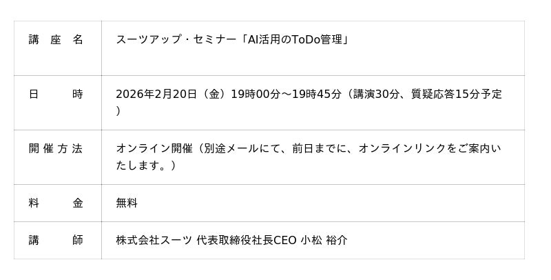 株式会社スーツ(所在地:東京都千代田区、代表取締役社長CEO:小松 裕介)は、2026年2月20日(金)19時から、当社代表の小松が講師を務めるスーツアップ・セミナー「AI活用のToDo管理」を無料開催します。