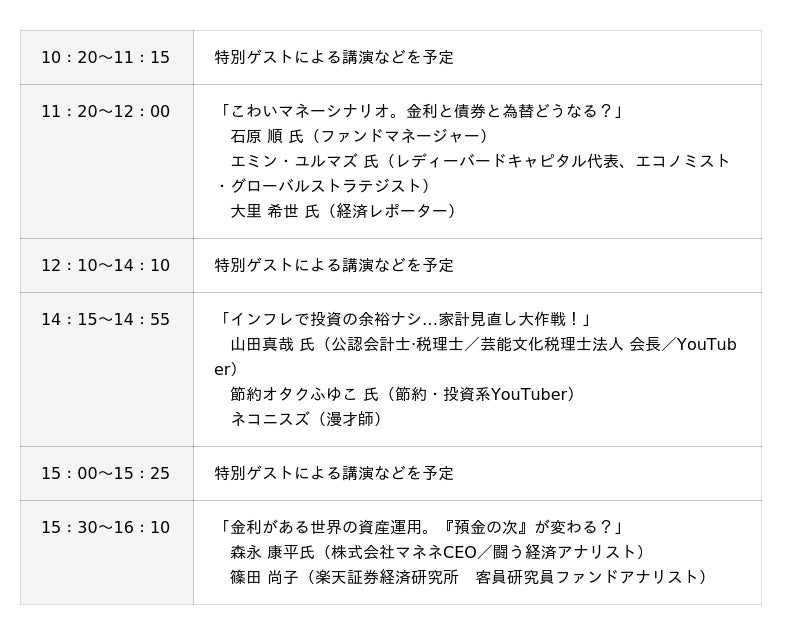 会場では、各プログラムでの講演のほか、楽天証券の社員にサービスやツールについて直接、質問可能なブースもあり、資産づくりに関する不安や疑問を解決できる機会を提供します。さらに、楽天証券の口座をお持ちでない方でも、申込不要で参加可能なイベントも同時に開催を予定しています。参加費は無料で、楽天証券の口座をお持ちのお客様はどなたでも、会場への申込・参加可能です。また、東京での会場参加が叶わないお客様でもご視聴可能なYouTubeでの同時ライブ配信もおこないます。