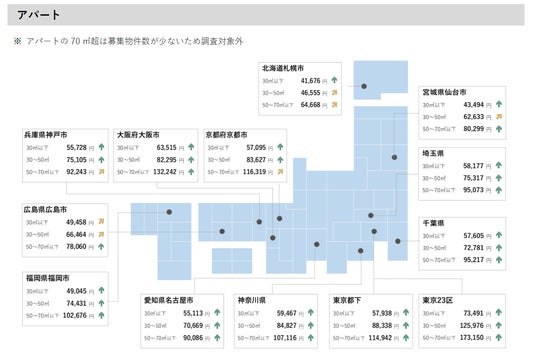 ・コメントでは、30平方メートル 以下を「シングル向き」、30平方メートル ~50平方メートル 以下を「カップル向き」、50平方メートル ~70平方メートル 以下を「ファミリー向き」、70平方メートル 超を「大型ファミリー向き」としています。