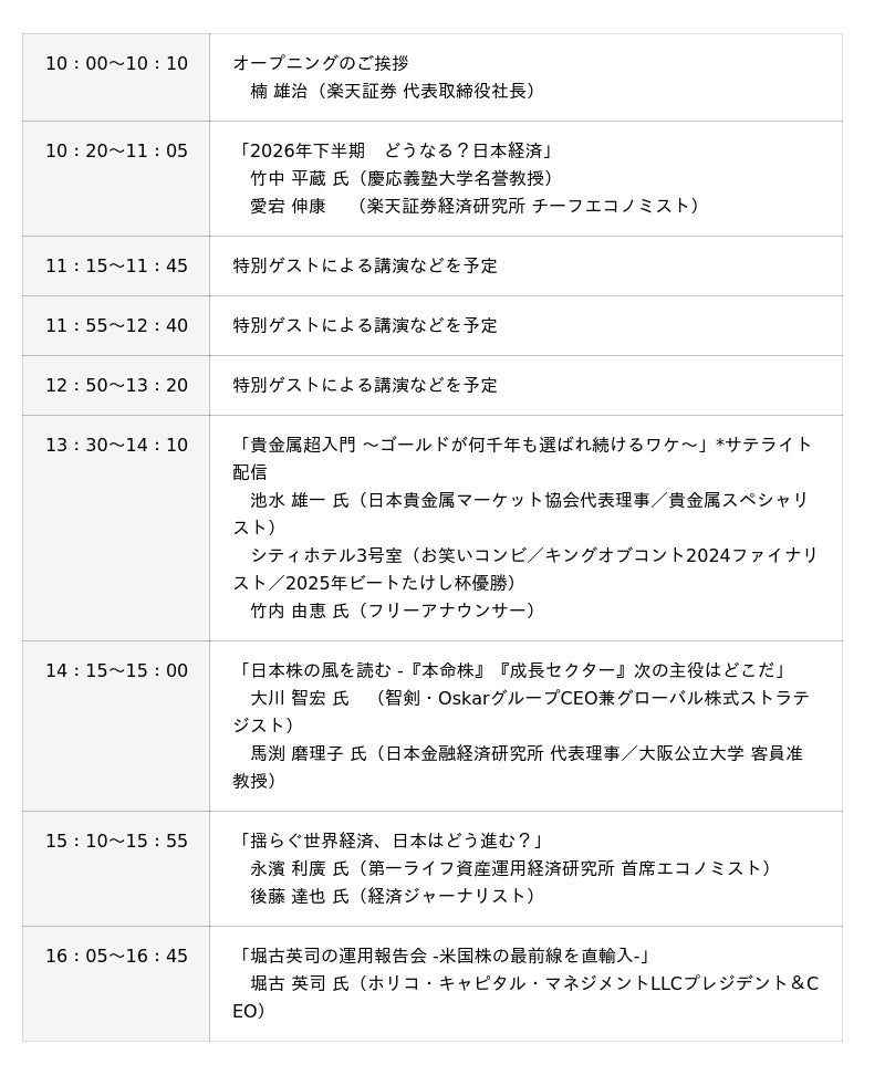 「楽天証券27th FES」では、「Investment is Entertainment!投資って、エンタメだ。」をテーマに、2026年7月12日(日)午前10時より、これから資産づくりを始めてみようと考えている方から、投資をさらに深めていきたい方まで、幅広いお客様が、楽しみながら知識を深められるプログラムを提供します。当日は、お客様の投資経験や関心にあわせた、「DISCOVERY STAGE」、「DEEP STAGE」、「CONNECT STAGE」の3つのステージを同時に実施します。投資の入口をわかりやすく解説する「DISCOVERY STAGE」では、楽天証券経済研究所のアナリストなどによる講演のほか、著名トレーダーのテスタ氏と経済愛好家の肉乃小路 ニクヨ氏による対談や、女優・タレントの森 香澄氏などをお招きし、株式や投資信託、金(ゴールド)、暗号資産といった、さまざまな投資の入口となるような情報をお届けします。次の投資のヒントになる情報を提供する「DEEP STAGE」では、慶応義塾大学名誉教授の竹中 平蔵氏や、経済アナリストの馬渕 磨理子氏をはじめとするゲスト講師に、最新のマーケット情報や、投資戦略に役立つ情報について講演いただきます。さらに、運用会社や楽天証券の社員が登壇する「CONNECT STAGE」では、自社の商品・サービスについて紹介するほか、会場限定で各講演後に登壇者に直接質問できるQ&Aセッションを用意し、会場ならではの相互コミュニケーションを実現します。