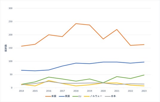図2:バイオDXに関連する研究プロジェクト件数の国別の推移(2014~2023年)