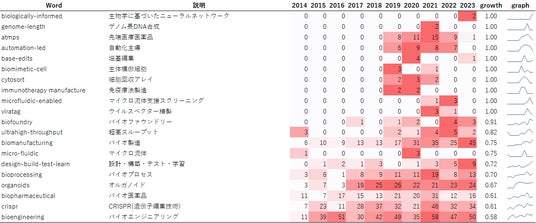 図1は2014年から2023年まで10年間の、バイオDXに関わるグラントの研究概要にふくまれる特徴的なキーワードの年次推移です。