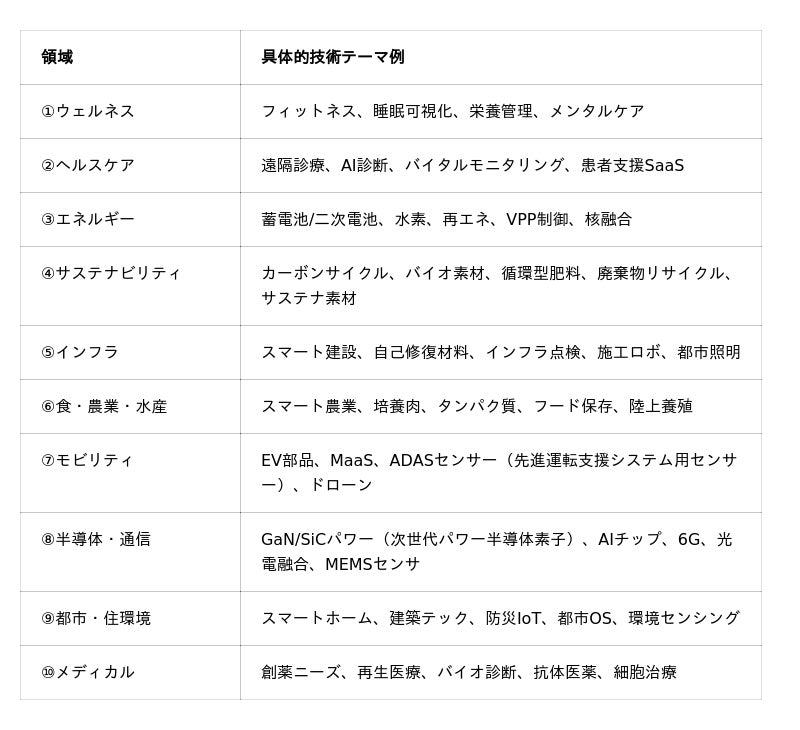 上記領域や具体的技術テーマは、想起いただきやすいようにご用意した例です。これら以外の領域や技術についても、随時ご相談が可能です。