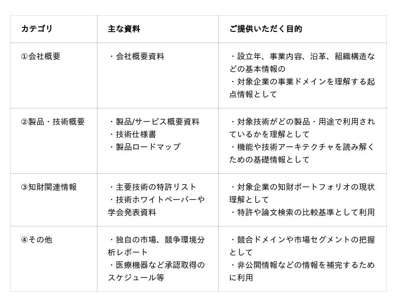 ▼ご依頼事項:DDレポートの作成に当たりまして、可能な範囲で以下に該当する非公開資料を事前にご提供いただくことをお願いしています。ご提供頂ける情報が多い程、より精度が高いアウトプットになります。