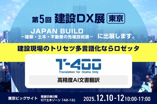 メタリアル・グループの株式会社ロゼッタ(代表取締役:五石 順一)は、2025年12月10日(水)~12日(金)に東京ビッグサイトで開催される「第5回 建設DX展 東京」(JAPAN BUILD-建築・土木・不動産の先端技術展-)に出展※1します。