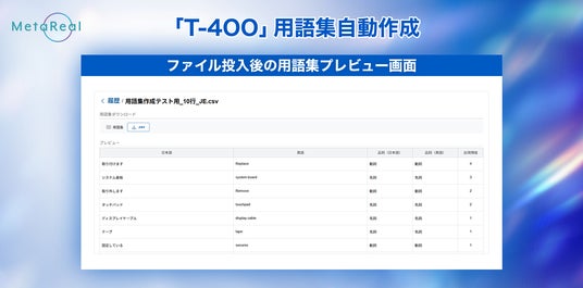 株式会社メタリアルグループで、国内市場No.1※のAI翻訳サービスを開発・提供する株式会社ロゼッタ(代表取締役:五石 順一)は、2025年12月、高精度AI翻訳「T-4OO(ティーフォーオーオー)」に、新機能「対訳自動作成」と「用語集自動作成」をリリースしたことをお知らせいたします。
