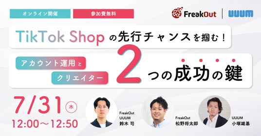 UUUM株式会社(本社:東京都港区、代表取締役 社長執行役員: 梅景 匡之、以下UUUM)は、「 "TikTok Shopの先行チャンスを掴む!" アカウント運用とクリエイター、2つの成功の鍵~発見型Eコマースの効果的な活用術~」と題したウェビナーを、2025年7月31日(木)12:00~12:50に開催いたします。