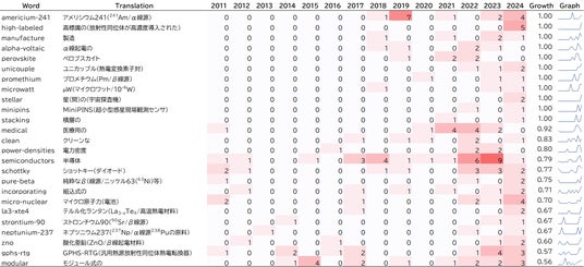 また、原子力電池の小型高出力化に関連する「stacking(積層)」「power-densities(電力密度)」などのキーワードも増加しており、特許分析の結果ともあわせると、放射線の直接電気変換にもとづく原子力電池の技術開発が活発化している傾向がうかがえます。