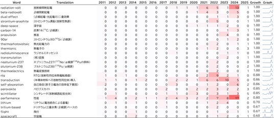 図3:原子力電池技術に関連する論文の概要に含まれるキーワードの年次推移
