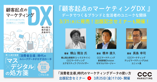 CCC マーケティングカンパニー「ユニークデータを解決力に。※1」をキーメッセージにさまざまな企業の課題解決に取り組むCCCマーケティング株式会社(本社:東京都渋谷区、代表取締役社長:北村和彦、以下、CCCマーケティング)は、横山隆治事務所(有限会社シックス・サイト、本社:東京都港区)の代表かつCCCマーケティングの「エグゼクティブ・アドバイザー※2」を務める横山隆治氏との共同著書『顧客起点のマーケティングDX データでつくるブランドと生活者のユニークな関係(発行:宣伝会議)』を、2022年3月31日(木)より全国の書店およびオンラインで発売いたします。3月7日(月)より予約受付(URL: