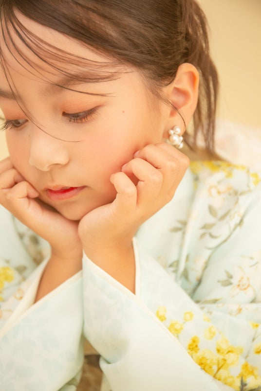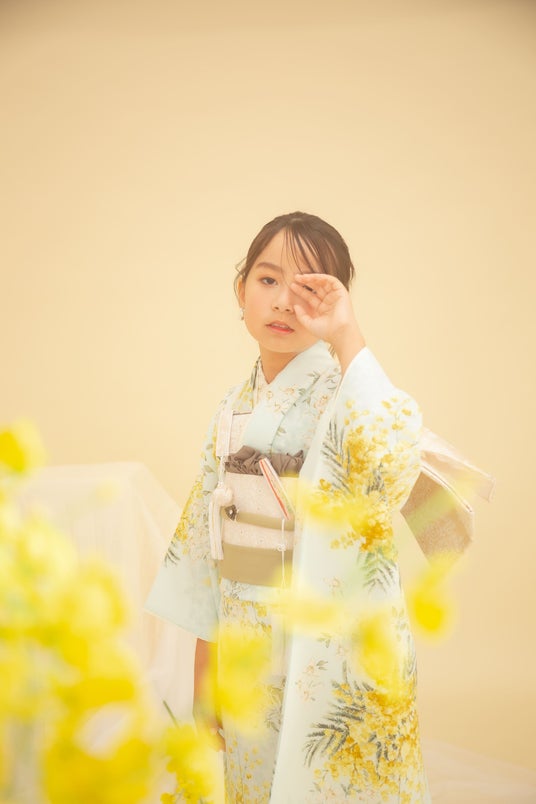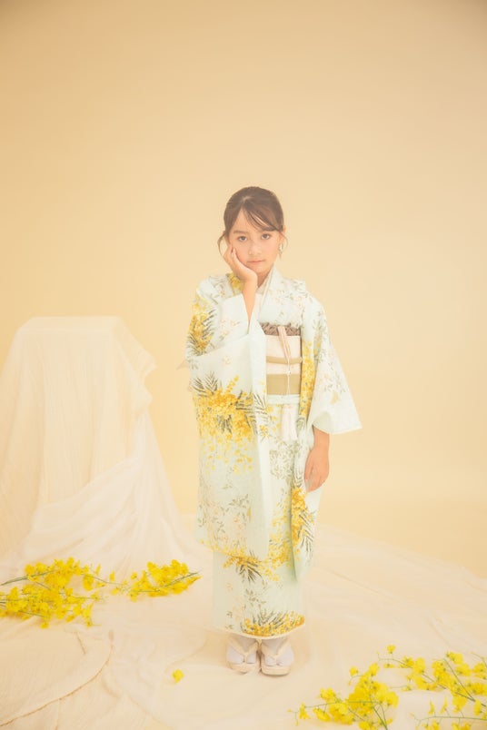 暖かい秋をイメージした黄色味のあるペーパーに、着物の柄のバランスと合わせて「可憐」「美しい瞳」という花言葉をもつオンシジュームを散りばめたシンプルだけど上品な背景となっております。
