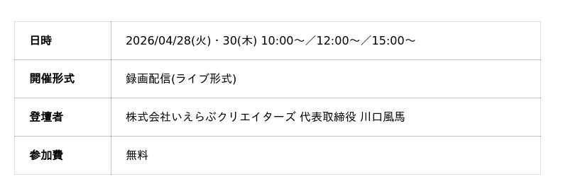 株式会社いえらぶGROUP不動産業界特化のDX支援サービスを展開する株式会社いえらぶGROUP(本社:東京都新宿区、代表取締役:岩名泰介、以下「いえらぶGROUP」)は、4月28日(火)・30日(木)の2日間、録画配信(ライブ形式)にて、『不動産SNS集客の「自社メディア化」セミナー ~SNSを経営資産に変え、集客・採用・成約率を最大化する普遍的ロードマップ~』を開催いたします。