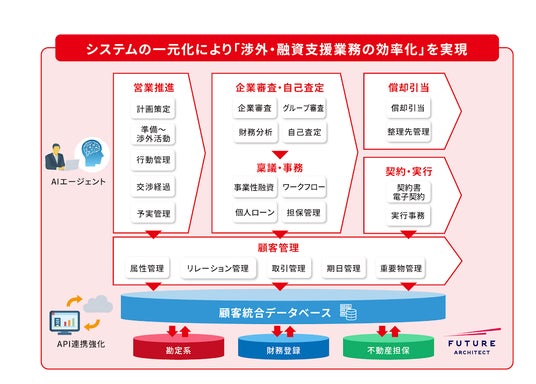 「次世代KeyMan」は、鹿児島銀行とフューチャーアーキテクトが共同開発します。鹿児島銀行がこれまで継続的に機能拡張・性能向上を進めてきた「KeyMan」と、フューチャーアーキテクトが全国 30 行以上の地域金融機関で展開するコンサルティングサービスを基に開発した「FutureBANK」を融合した、先進かつ統合的な融資支援システムです。現行の「KeyMan」では大きく3つに分かれていた、「融資支援」「営業支援」「ローン管理」のシステムを統合します。また、APIを通じて内部・外部システムとのデータ連携を行うことで、AIエージェント等を活用したリアルタイム分析が実現します。これにより、融資業務に関わるコミュニケーションの向上、信用リスク対策、与信判断の示唆が可能になります。全面的なアーキテクチャ刷新とシステム内外との連携強化により、渉外・融資支援業務の効率化ならびにサービスの向上を目指します。