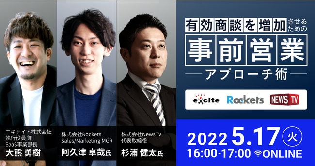 エキサイト株式会社(所在地:東京都港区、代表取締役社長:西條晋一、以下「エキサイト」)は、2022年5月17日(火)16:00~17:00に、株式会社NewsTVの杉浦健太氏、株式会社Rocketsの阿久津卓哉氏を迎え、「有効商談を増加させるための事前営業アプローチ術」をテーマに参加費無料のウェビナーを開催することをお知らせします。