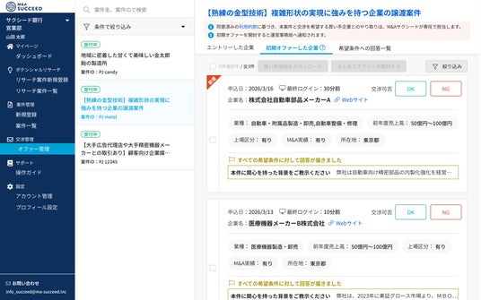本機能は、顧客がアドバイザリー契約を締結する前の初期段階から、譲受候補企業からの具体的な譲受条件を提示できる仕組みです。