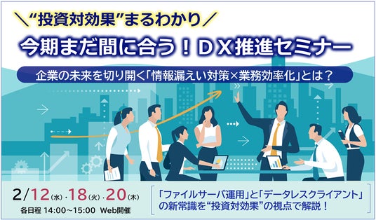 本セミナーでは、これらのリスクを回避しつつ、「情報漏えい対策×業務効率化」への近道となる「ファイルサーバ運用」と「データレスクライアント活用」について、投資対効果を踏まえて解説する他、事例やデモンストレーションも交えわかりやすくご紹介します。