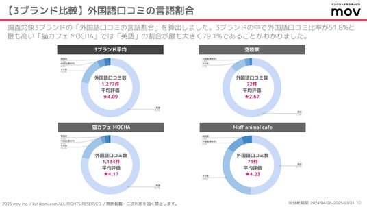 3ブランドの中で外国語口コミ比率が51.8%と最も高い「猫カフェ MOCHA」では「英語」の割合が最も大きく79.1%であることがわかりました。