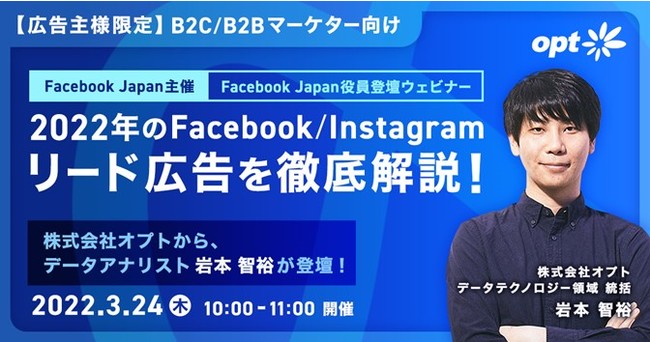 「デジタルで、この国の新しい基本をつくる。」をミッションに掲げ、顧客の事業成長に伴走する株式会社オプト(本社:東京都千代田区、代表取締役社長 CEO:栗本 聖也、以下、オプト)のデータアナリスト岩本 智裕が、本年3月24日(木)10:00~11:00に開催されるFacebook Japan主催のB2C/B2Bマーケティングをテーマにしたウェビナーイベント「【広告主様限定】Facebook Japan役員登壇 2022年の新規顧客獲得に効く!Facebook/Instagram のリード獲得広告」にて、講演をいたします。