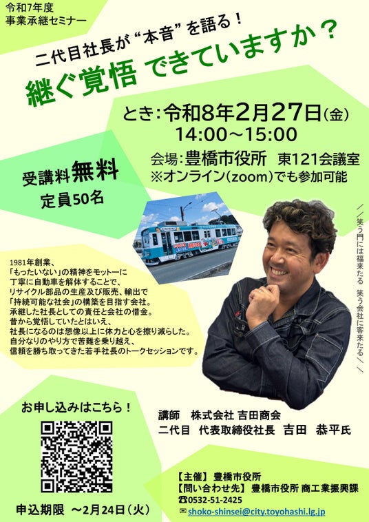 豊橋市豊橋市では、「廃業させないまち とよはし」をスローガンに、年2回事業承継セミナーを開催しています。今回は、親族内承継として親から子へ事業を引き継いだ事例についてトークセッションを開催します。