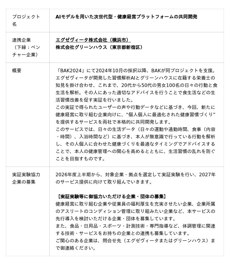 【神奈川県 BAK × AUBA】ビジネスアクセラレーターかながわ(BAK) エグゼヴィータ×グリーンハウス「AIモデルを用いた次世代型・健康経営プラットフォームの共同開発」