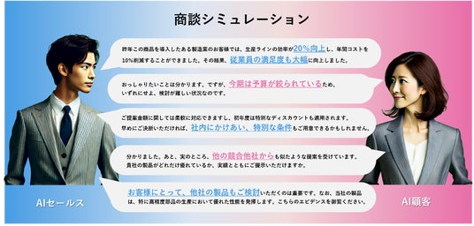 <AIペルソナ活用例>◆リアルな商談シミュレーションによるセールスシナリオ設計顧客とセールスパーソンのAIペルソナを生成。ビジネス成果がなにか、商談スタンスはどういう特徴かといった情報を学習させることで、リアルな商談のシミュレーションを生成し、自社の強みを訴求するセールスシナリオを設計する等の活用が可能。