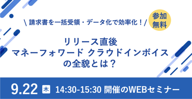 株式会社マネーフォワードは、9月22日(木)に、8月24日(火)に提供を開始した新サービス『マネーフォワード クラウドインボイス』の全貌を紹介するセミナー「請求書を一括受領・データ化で効率化! リリース直後『マネーフォワード クラウドインボイス』の全貌とは?」を開催します。