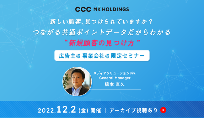 CCCMKホールディングス株式会社(本社:東京都渋谷区、代表取締役社長:高橋 誉則、以下「CCCMKHD」)は、このたび、約7,000万人のT会員の購買データと日本全国約46万人のテレビ視聴データを用いて、広告主様/事業会社様向けに、「つながる共通ポイントデータだからわかる“新規顧客の見つけ方”」をテーマにしたオンラインセミナーを、2022年12月2日(金)に開催することを、お知らせいたします。