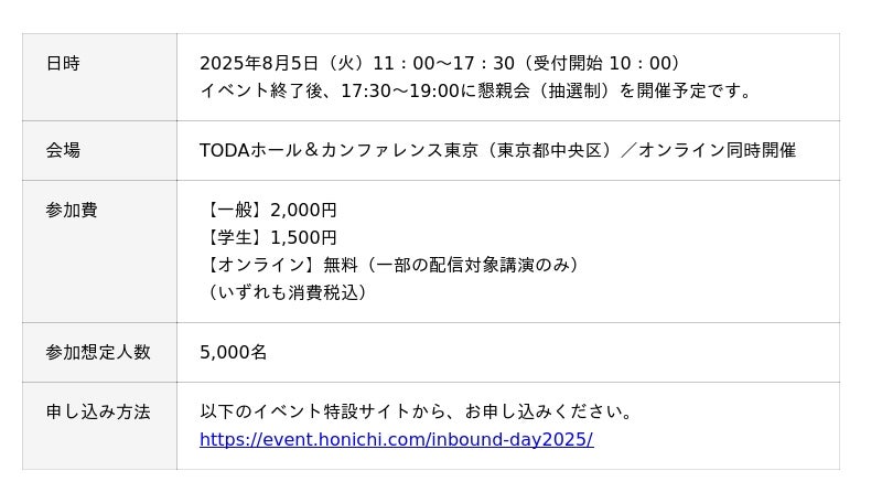 お知らせ【「THE INBOUND DAY 2025」スポンサー募集中!】インバウンドの未来を共創しませんか?「THE INBOUND DAY 2025 -まだ見ぬポテンシャルへ-」では、本カンファレンスを盛り上げてくださるスポンサー企業様を募集しています。