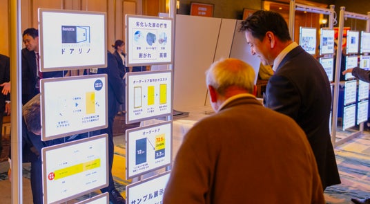 セミナー会場には、家賃アップや空室改善のために使用している部材を実際にご覧いただける「Vitrine Media」ブースを設置しました。ブースでは、賃貸経営に役立つ最新の部材や設備を展示するとともに、それらを活用した改善事例や効果について、プレゼンテーション形式で詳しく解説しました。