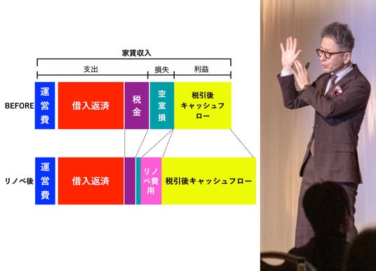 さらに、賃貸経営における節税対策や次世代に資産を引き継ぐための相続対策を見据えたファイナンス活用についても触れ、インフレ時代に対応した家賃アップの戦略やランニングコスト削減の施策について具体的なノウハウを共有。不動産投資の視点からも、長期的かつ持続可能な賃貸経営を実現するための実践的なアプローチが示されました。