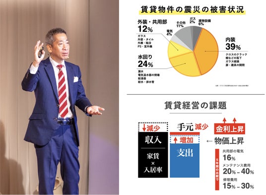 株式会社クラスコ・ホールディングス専務取締役の清水秀晴が、「家賃アップ成功の裏側と具体的手法」をテーマにしたセミナーを開催しました。本セミナーでは、能登半島地震の影響を踏まえた最新の市場動向や、その対策について詳しく解説。地震発生時における賃貸物件の被害状況やクラスコの迅速な対応、今後の地震対策につながる事例も共有しました。