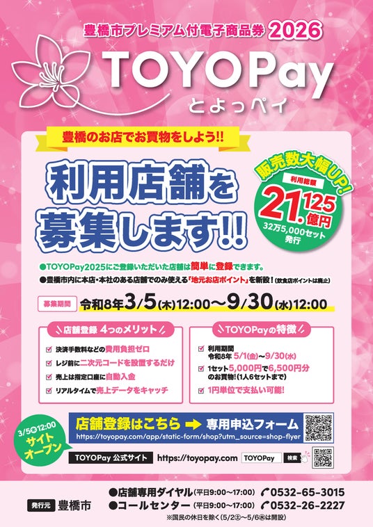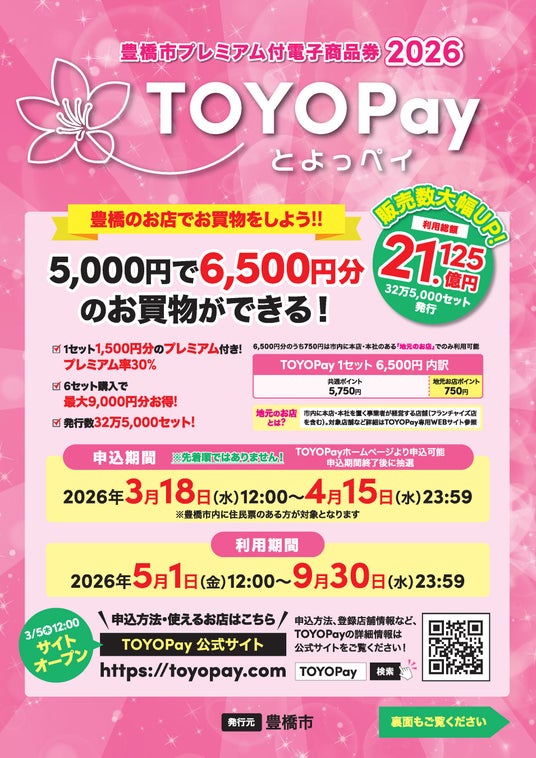 豊橋市は、国の物価高騰対応重点支援地方創生臨時交付金を活用し、食材費高騰の影響を受ける市民、並びに事業者を迅速にサポートするため、「豊橋市プレミアム付電子商品券2026TOYOPay」を発行します。