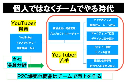 2022年からYouTuberをはじめとするインフルエンサーに対してP2Cによる商品プロデュースのサポート事業を行なっており、チャンネル登録者数平均10万人のYouTuberを平均5000万円以上のマネタイズ成功に導いている。