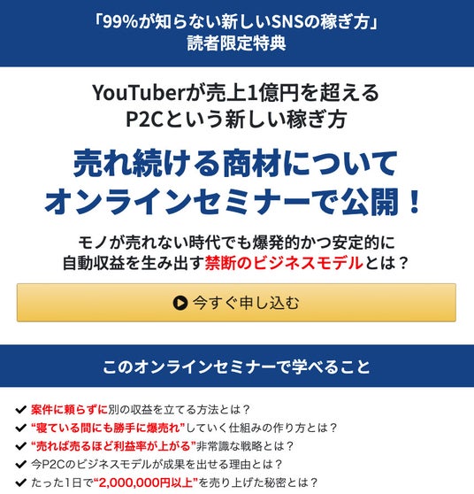 99%知らないSNSの新しい稼ぎ方の特典ページとして サブスクP2Cのビジネスモデルのウェブセミナーを開催しています。 https://subsc-d2c.com/p7upYouTuber(インフルエンサー)になぜ サブスクP2Cビジネスがなぜ求められているのかについて解説いたします。