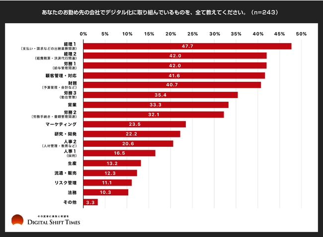 デジタル化に「取り組んでいる」と回答した人のなかで、デジタル化に取り組んでいる業務は、上から「経理1(支払い・請求などの出納業務関連)(47.7%)」「経理2(経費精算・決済代行関連)(42.0%)」「労務1(給与管理関連)(42.0%)」であることがわかりました。