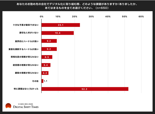 デジタルシフトの取り組みにおける課題は、「十分な予算が確保できない(23.1%)」「適切な人材がいない(19.4%)」「業界的にハードルが高い(9.2%)」「業務を横断するハードルが高い(9.2%)」という項目が上位となりました。一方で、52.2%が「特に課題はない/なかった」と回答しました。なかでも、デジタルシフトに消極的だった「不動産」や「小売」業界ではこの回答の割合が高く、現状の業務プロセスで危機的状況に陥っていない分野も存在することが示唆されています。