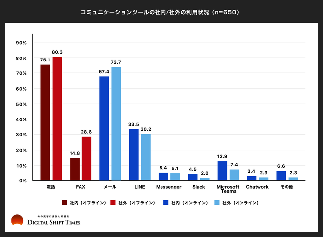 今回の調査では、全ての業務に共通するコミュニケーションツールについても伺いました。社内コミュニケーションで利用されているものは、上位から「電話(75.1%)」「メール(67.4%)」「LINE(33.5%)」となりました。電話とメールが圧倒的で、「Microsoft Teams」「Slack」「Chatwork」などのビジネスチャットツールの使用は少ないことがわかりました。