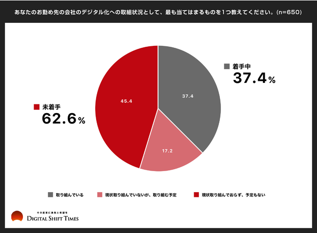 デジタルシフトについて「取り組んでいる」と回答したのは全体の37.4%で、60%超の企業がデジタルシフトに未着手という実態が明らかになりました。
