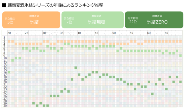 麒麟麦酒の「氷結」シリーズについて、3位「氷結」と、7位「氷結無糖」、22位「氷結ZERO」を比較しました。ノーマルの「氷結」は、全年齢で3、4位とランキング上位を維持しており、定番の商品として全年齢で人気のようです。無糖・甘くない味わいが特徴の「氷結無糖」は、20代にかけてランキングが上昇し、36歳で4位にランクインしました。一方糖類・プリン体ゼロの「氷結ZERO」は、30代にかけて上昇し、39歳で14位にランクインしています。どちらも糖類を含まない商品ですが、ターゲットが異なるため、「氷結無糖」は自宅で食事と飲酒が増える20代にかけて、「氷結ZERO」は健康意識が高まる30代にかけてランキングが上昇しているのかもしれません。
